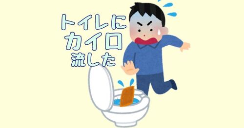 やっちまった!気付いた時にはもうすでにカイロは見当たらなかった。もうパニックよ、便器とか配管とかの奥の方で詰まったら業者呼ばなくちゃだなぁ(しかも水廻りって高いよなぁ)とりあえず夫に連絡して水を流してみろという話になった。